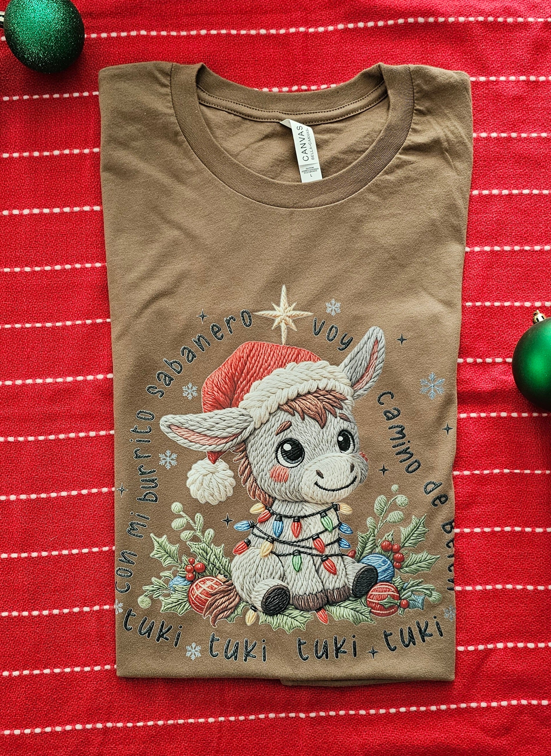 Celebrate the holidays with the cutest “Burrito Sabanero” inspired tee! Designed with a charming faux crochet donkey and the beloved “tuki tuki tuki tuki” phrase, this shirt brings cultural Christmas joy to every outfit. Perfect for posadas, family photos, or gifting. 🐴🎄💛