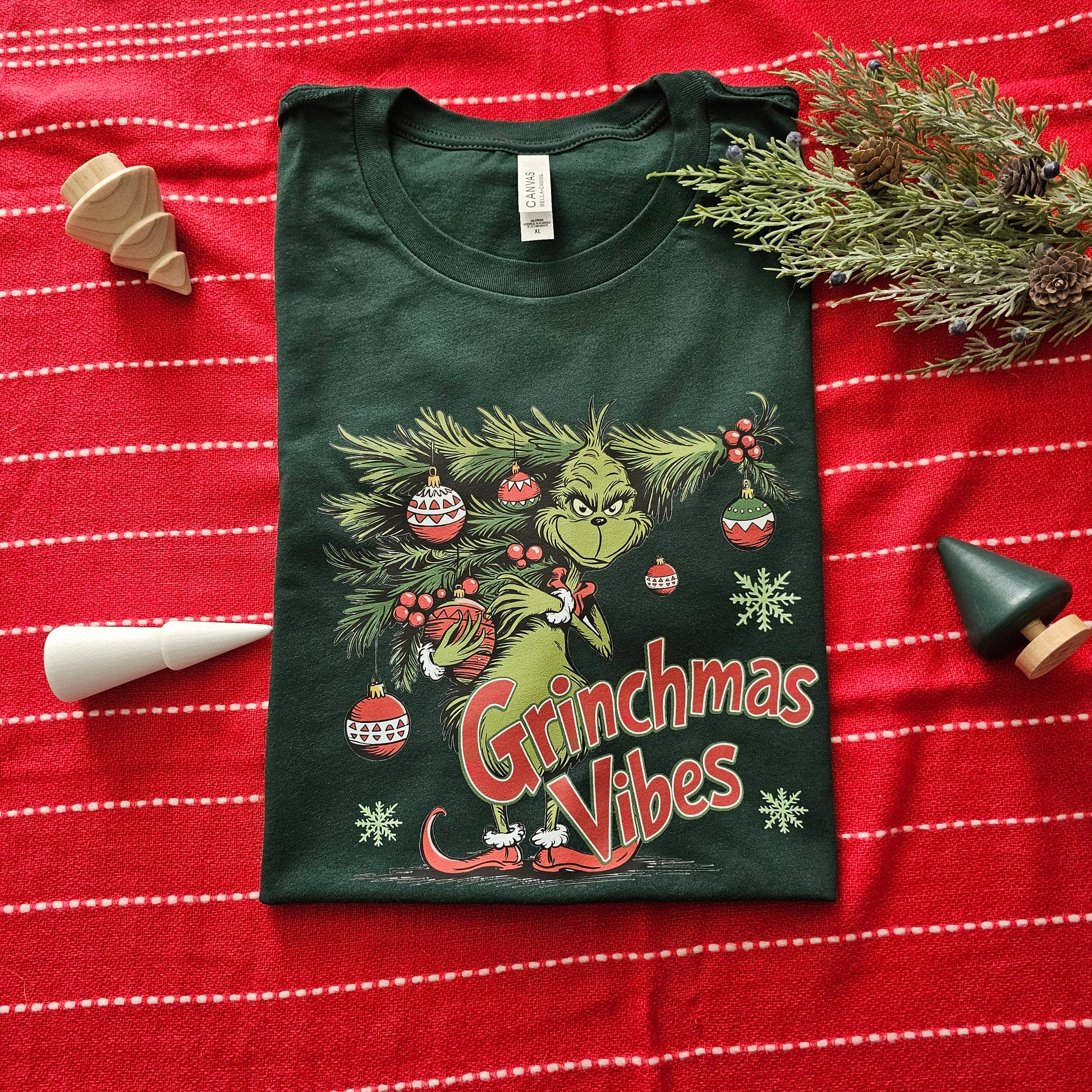 This shirt radiates that perfect combination of grinch vibes and Christmas cheer. Spread joy and festive energy everywhere you go this season with this must-have shirt.