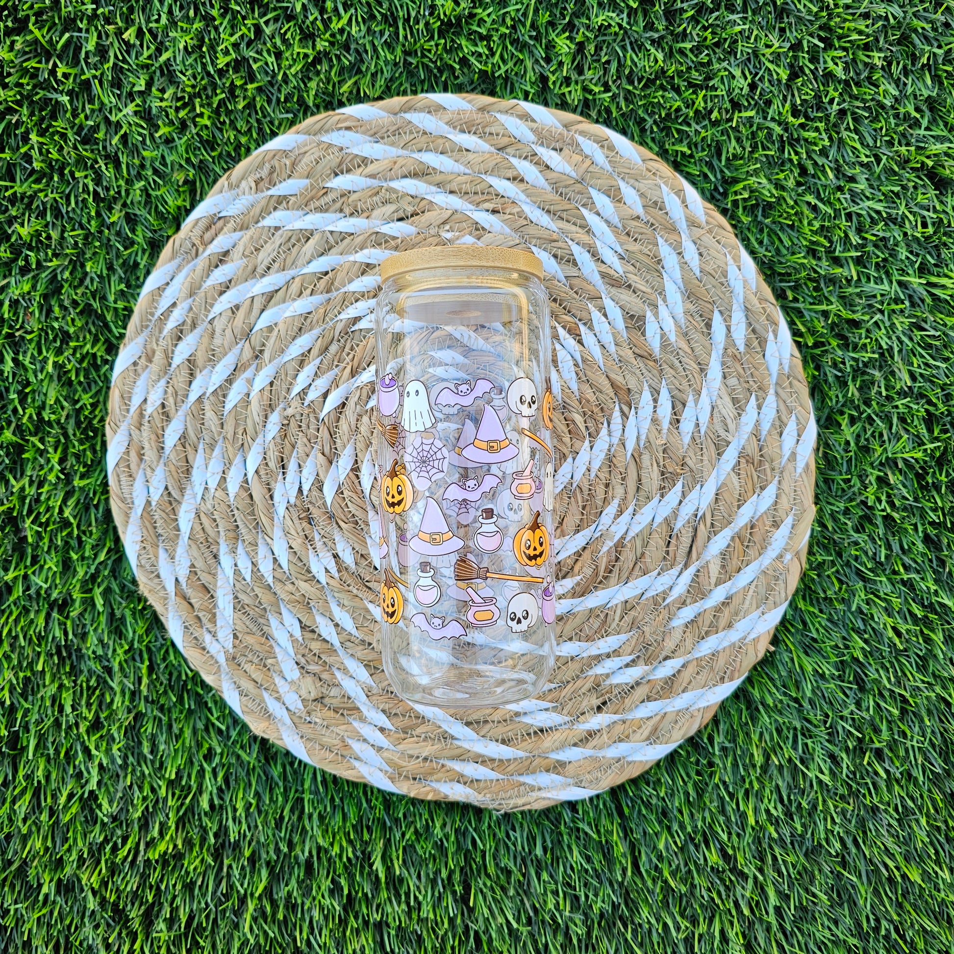 Bring a little spooky-cute magic to your drinks! This 20oz Halloween glass cup features an adorable all-over design with pumpkins, ghosts, witch hats, skulls, brooms, and cauldrons in soft pastel tones. Perfect for iced coffee, tea, or any cold drink, this tumbler comes with a bamboo lid and reusable strawโmaking it both stylish and eco-friendly.