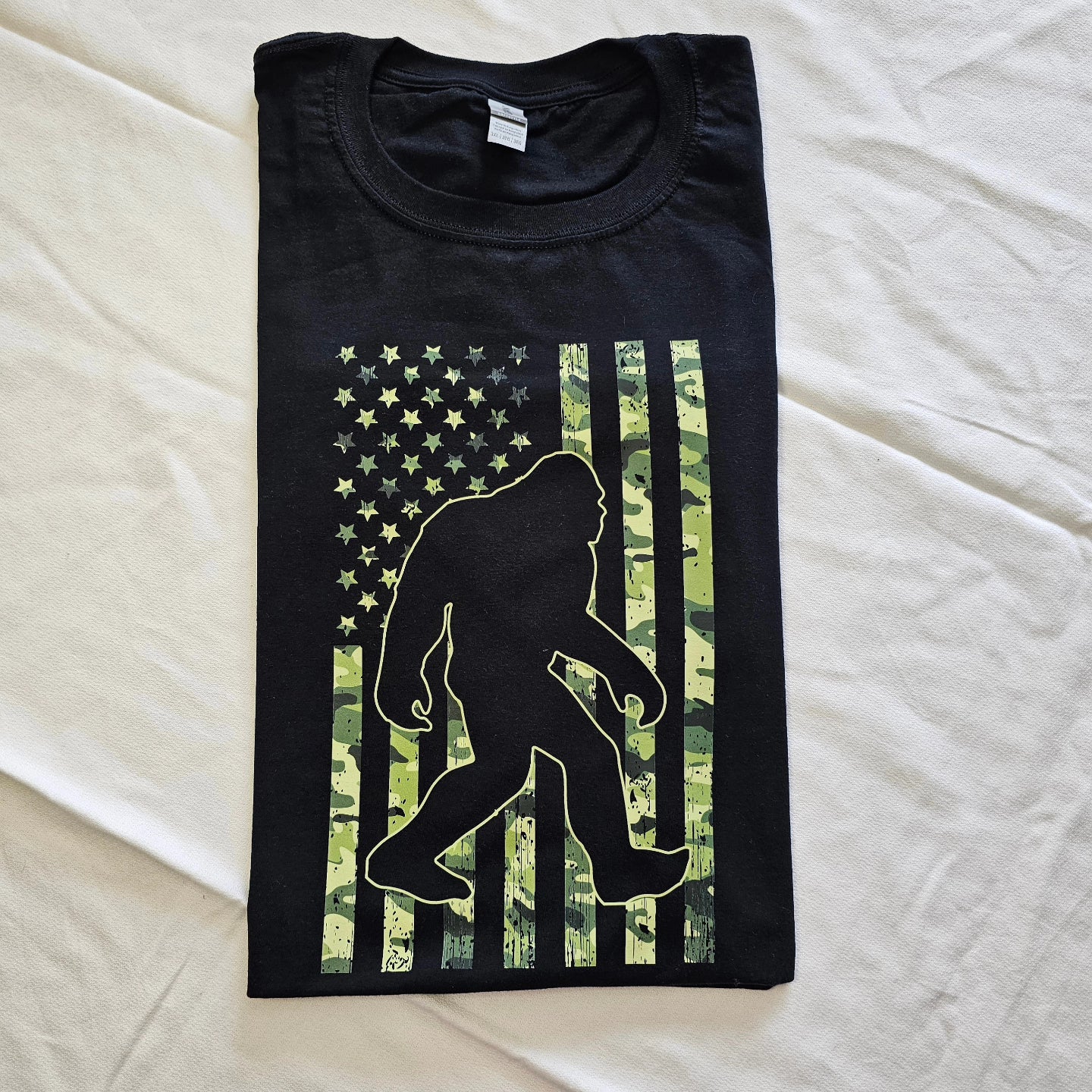 Unleash your inner explorer with our Flag Sasquatch shirt! Featuring a camouflage design and a bold flag image, this shirt is perfect for both outdoor adventures and patriotic pride. The sasquatch graphic adds a touch of mystery to this unique and vibrant shirt. Get yours today and stand out from the crowd!