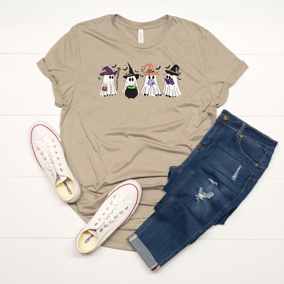 Get ready for the spooky season with our Four Witches shirt! Featuring cute ghost witches, this trendy and colorful shirt is the perfect addition to your Halloween wardrobe. Don't miss out on this hauntingly charming piece!