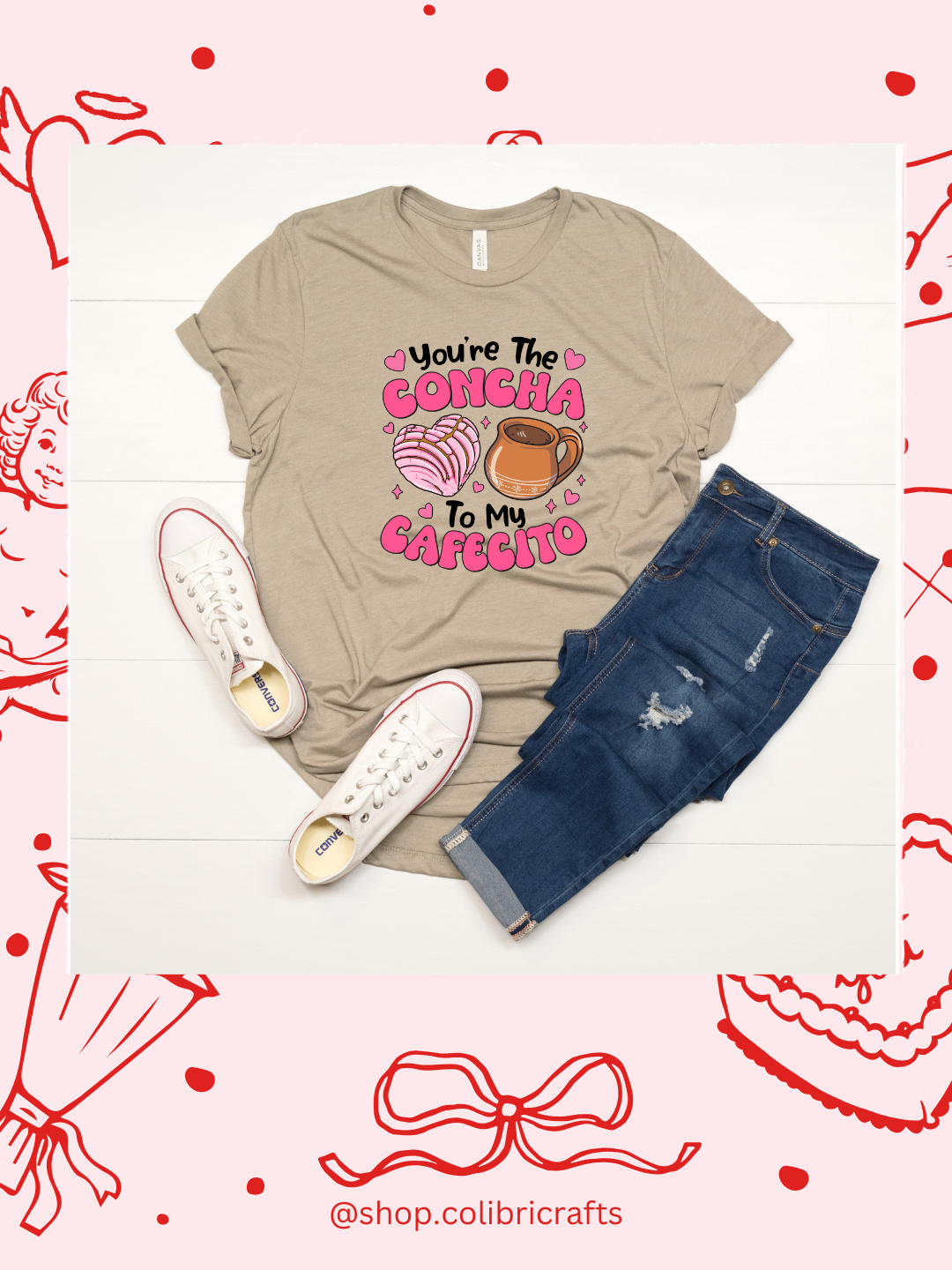 This tee features the phrase “You’re the concha to my cafecito” with a cozy coffee mug and a sweet concha — the ultimate duo in love and in life.