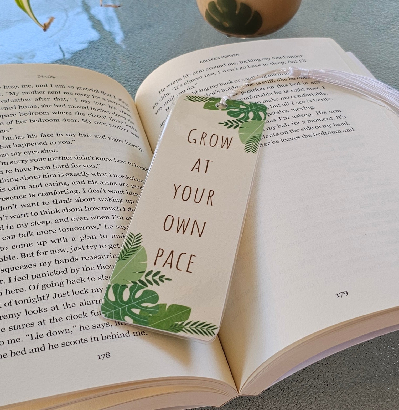 This handmade bookmark features plant illustrations and the uplifting quote "Grow at your own pace"- perfect for plant lovers, bookworms and anyone embracing slow, steady growth.Β